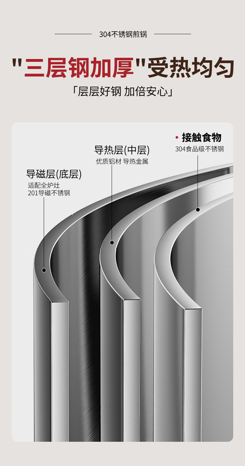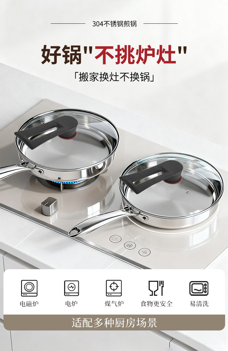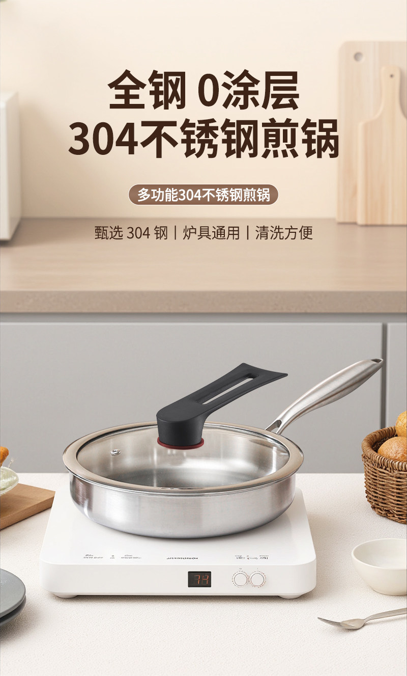 赫巴兹无涂层304不锈钢煎锅家用平底锅煎牛排锅煎盘不易粘炒锅+可立盖